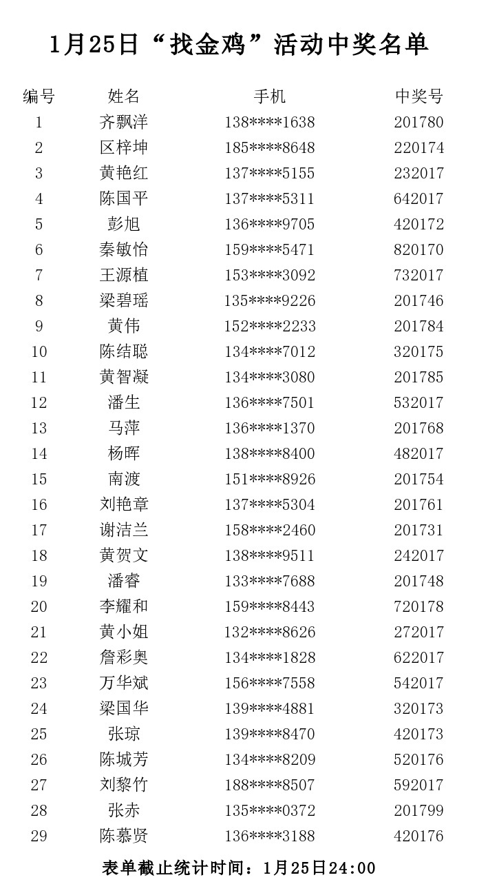 25日一共产生29位中奖人,