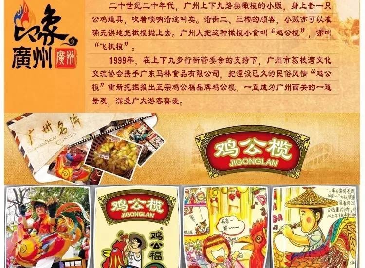 鸡公榄本身和公鸡没有什么关系,而是上世纪二三十年代,广州西关一些吹着唢呐沿途叫卖腌制白榄的小贩。因为他们大多在身上套着颜色鲜艳的公鸡道具,所以街坊们便戏称这种榄为“鸡公榄”。