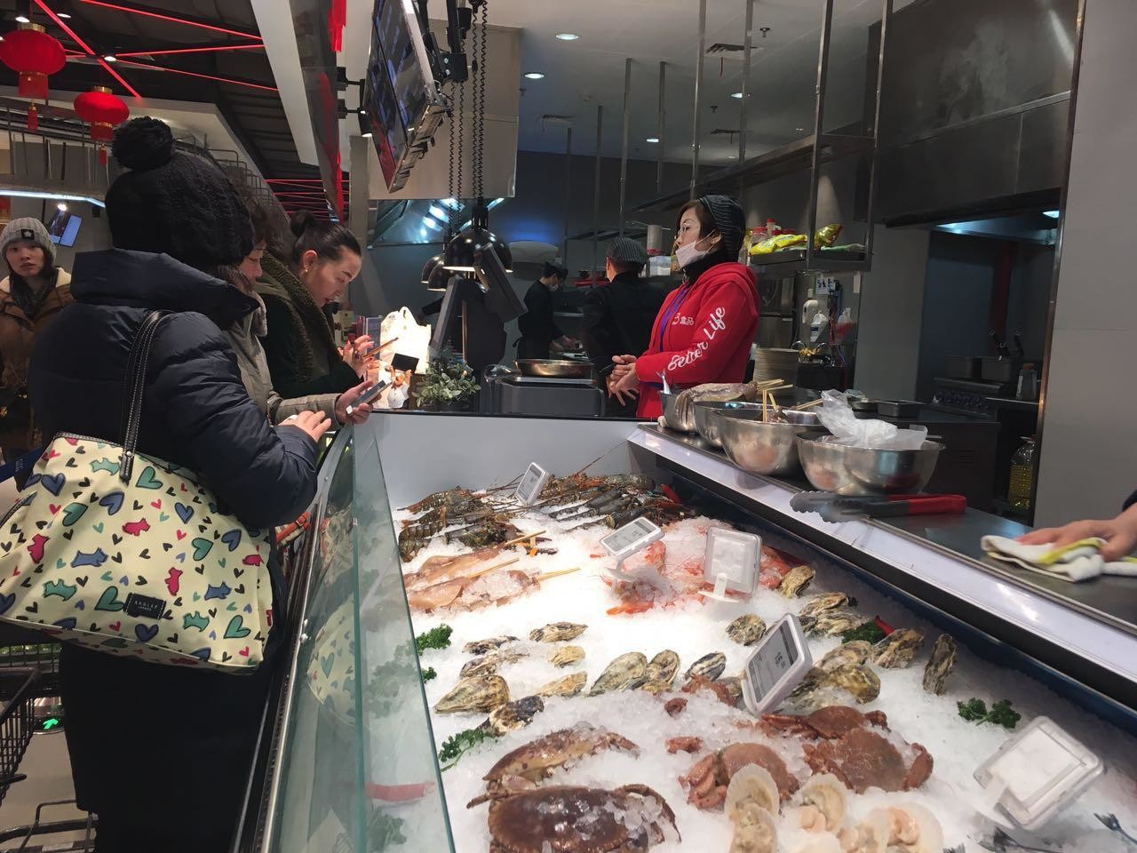 正月大年初二,李先生一家五口来到位于杨浦宝地广场的盒马鲜生会员体验店里吃海鲜。在水产区,一排排大型玻璃鱼缸整齐摆放,里面有珍宝蟹、黄金蟹、波士顿龙虾、澳洲大龙虾、皮皮虾等来自世界各地的鲜活海鲜,均以低于饭店的亲民价格出售。