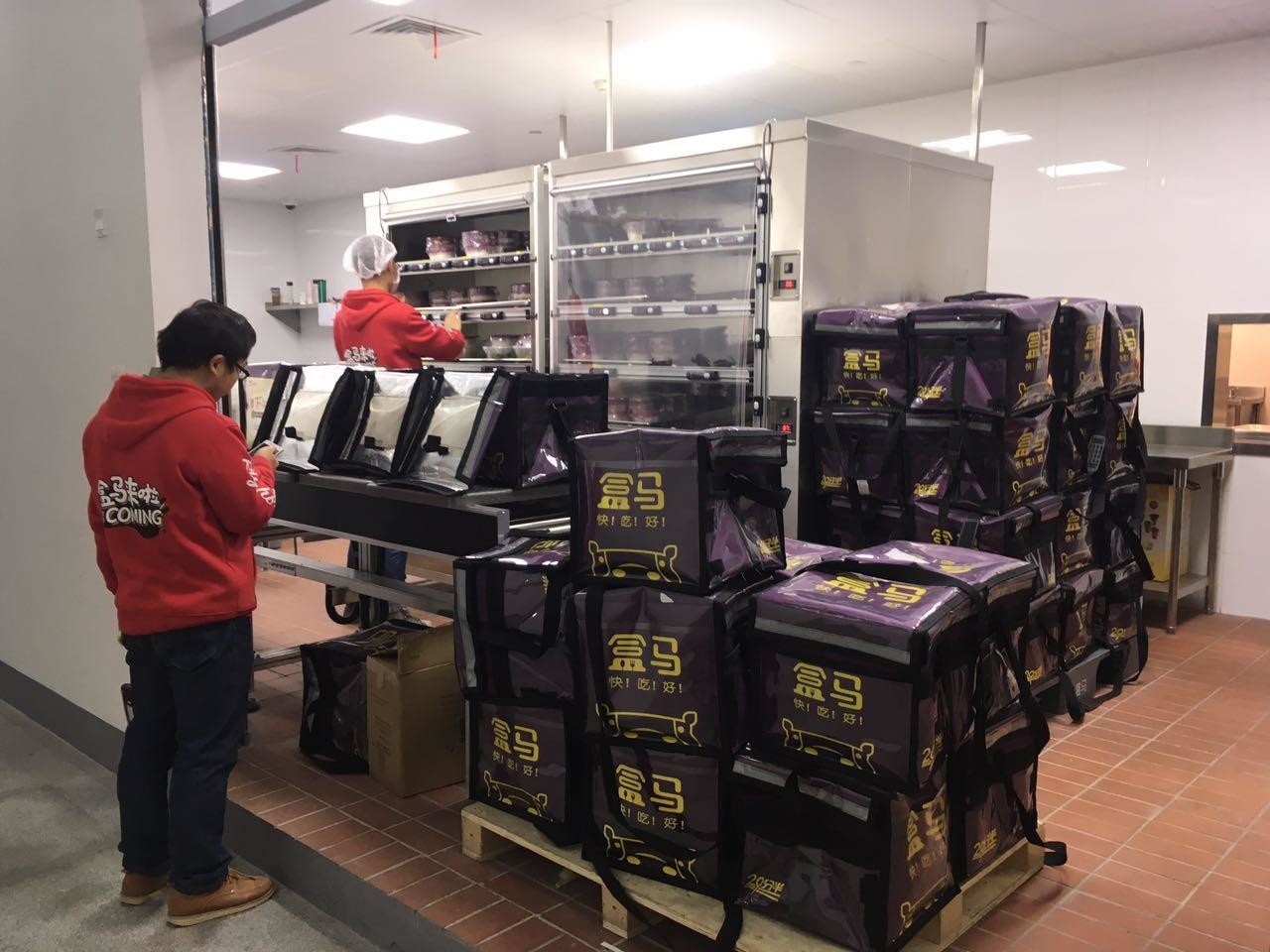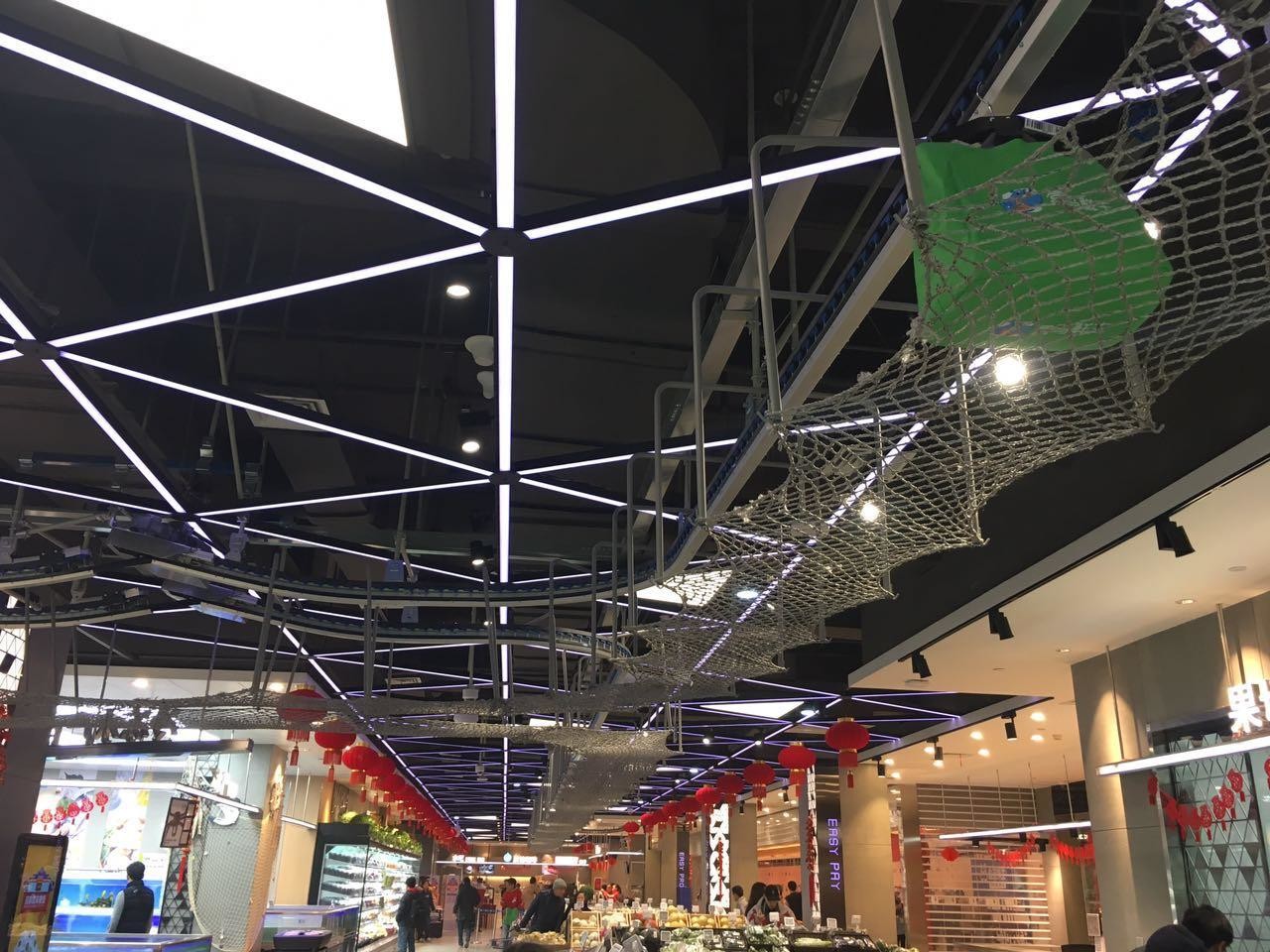 线上预定盒马包括冷链的生鲜和热链的外卖。整个超市就是一个前场仓库,在门店里,处处可见拣货员手里拿着手机,对着App订单拣货,拣齐的货品装进一个个绿袋子里。在超市顶部传输带上,一个个绿袋子在顾客头顶上“飞来飞去”,这就是挑选好要运往客户家中的生鲜菜品。食物仓库对顾客完全开放的形式建立起顾客对食物的信心,这对生鲜业来说是最重要的。