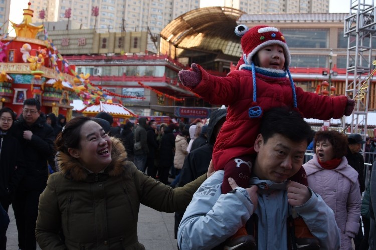 2017-01-30,辽宁沈阳。 皇寺庙会,小孩骑在爸爸脖子上。好妈乐,孩子笑,老公心里美美哒!作者:本哥