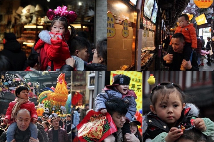 2017-01-28,上海黄浦。大年初一,豫园庙会上,许多孩子骑在大人肩上,徜徉在各地美食和特色物品商铺间,感受节日的味道。作者:老兵新传