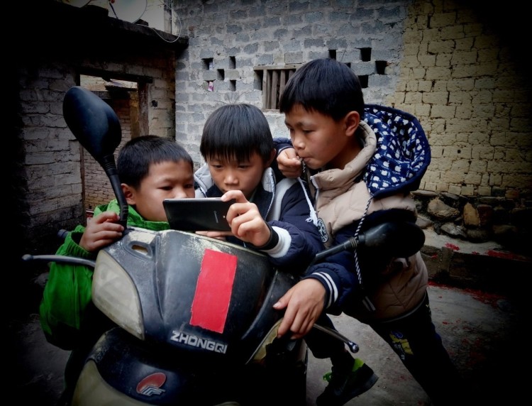 2017-01-30,广西梧州。几个农村孩子围在一起,通过手机收看春节联欢晚会。作者:裕法