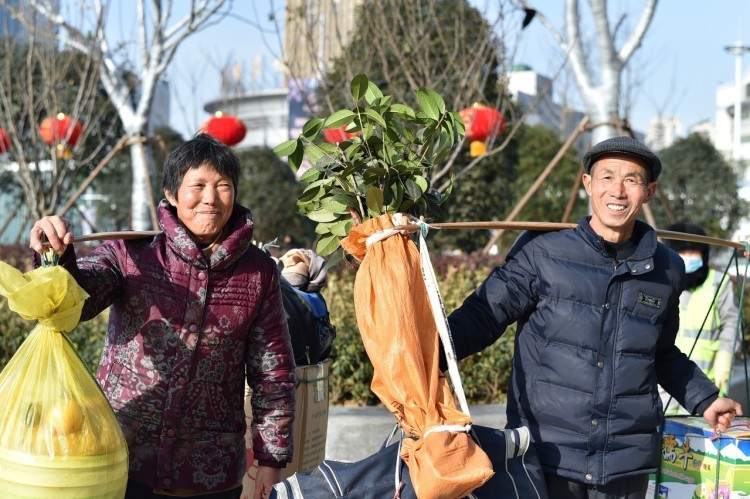 2017-01-21,安徽合肥。64岁农民和妻子挑着家乡的金桂树苗探望远在广州的儿子。“儿子从小离家读书,毕业去了广州工作,和我们说,梦中时常闻到家乡桂花的清香。”老人心疼儿子,决定将自家院落中的的一株金桂挖起,利用春节期间亲自送去,以释儿乡愁。作者:纪实