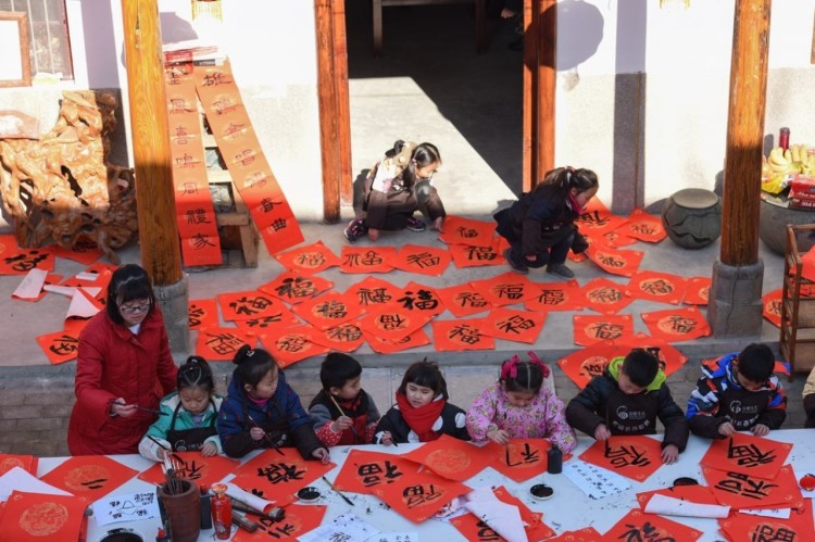 2017-01-16,江苏徐州。30多名中小学生在书法家协会带领下,来到乡村为百姓写春联送祝福。作者:云天