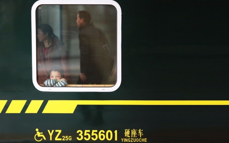 2017-01-24,江苏南昌。火车站,一名小孩趴着眺望车窗外,眼里充满了对家的期盼。作者:Ya