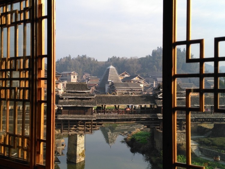 2017-01-29,广西三江。侗族自治县林溪镇岩寨,合龙风雨桥与远处的鼓楼在朝阳的照耀下,美丽而静谧。作者:王滋创