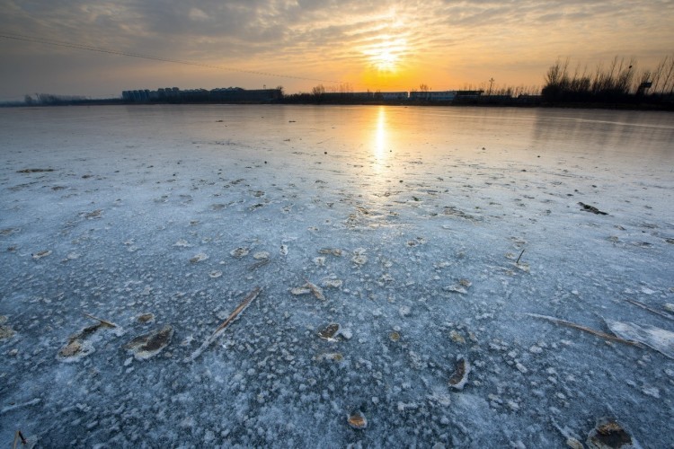 2017-01-31,山东庆云。彩云堆积,金色的阳光洒在冰封的河面上,一片璀璨。作者:醉翁