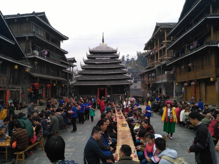 2017-01-29,广西三江。侗族自治县马安镇,游客体验侗族百家宴。作者:王滋创