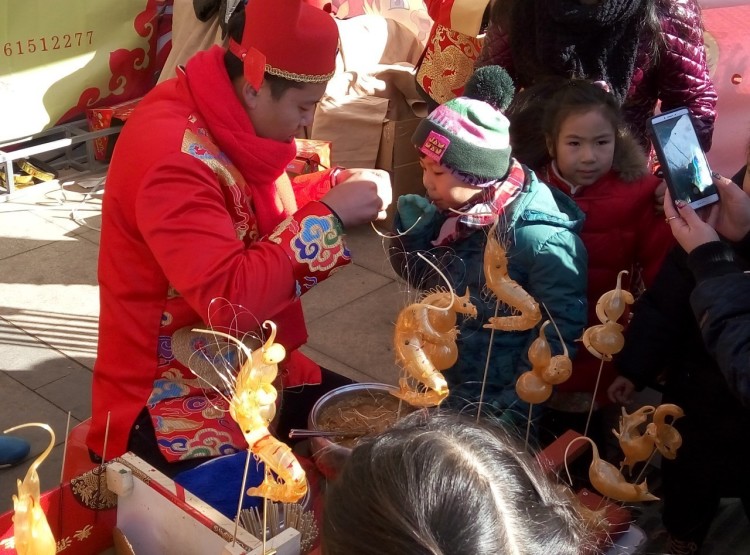 2017-01-30,北京通州。运河文化庙会上,小朋友吹起糖人,体验中国传统民间艺术的独特魅力。作者:月生