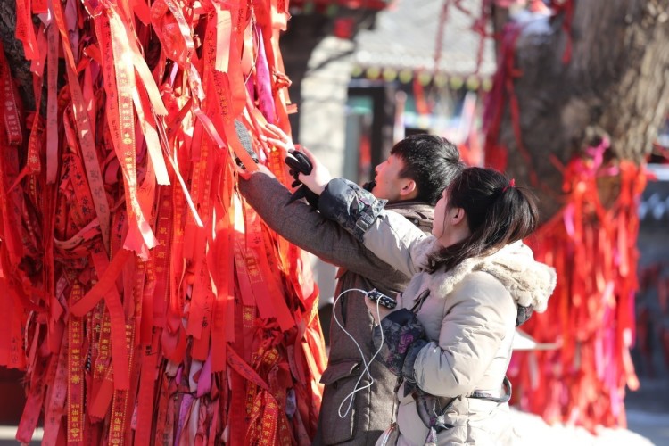 2017-01-30 ,辽宁沈阳。正月初三,一对青年男女在锡伯族家庙的许愿树上系上甜蜜的愿望。作者:崔凯