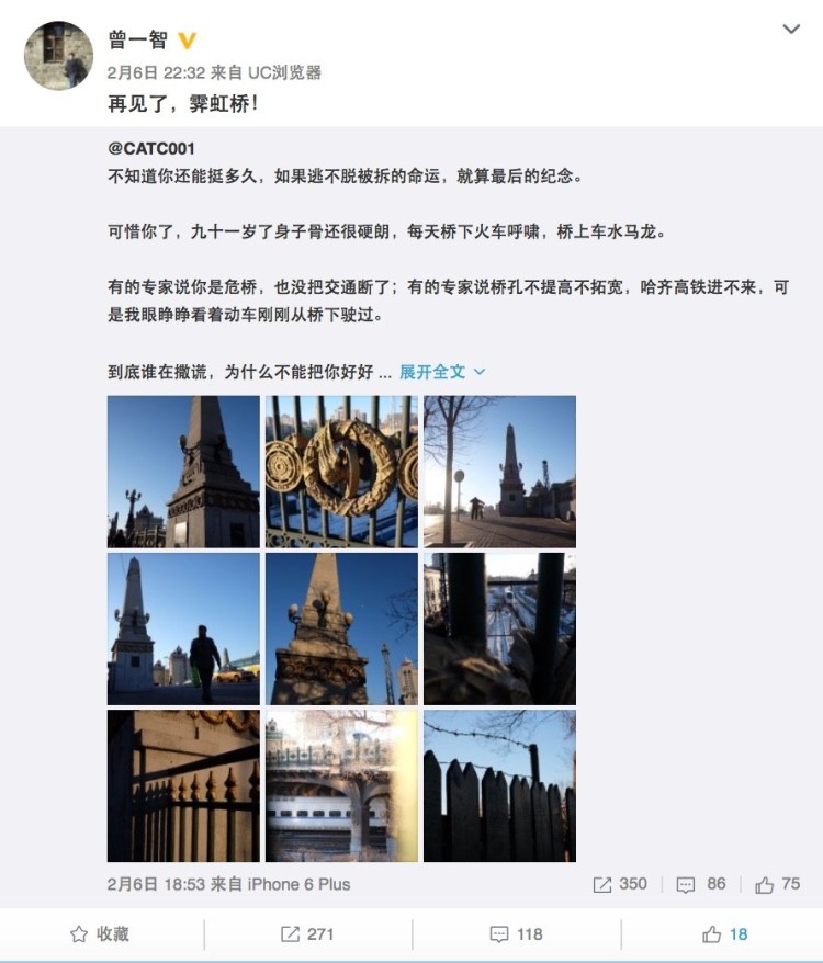 曾一智的最后一条微博,是向她关注的哈尔滨老桥霁虹桥告别。