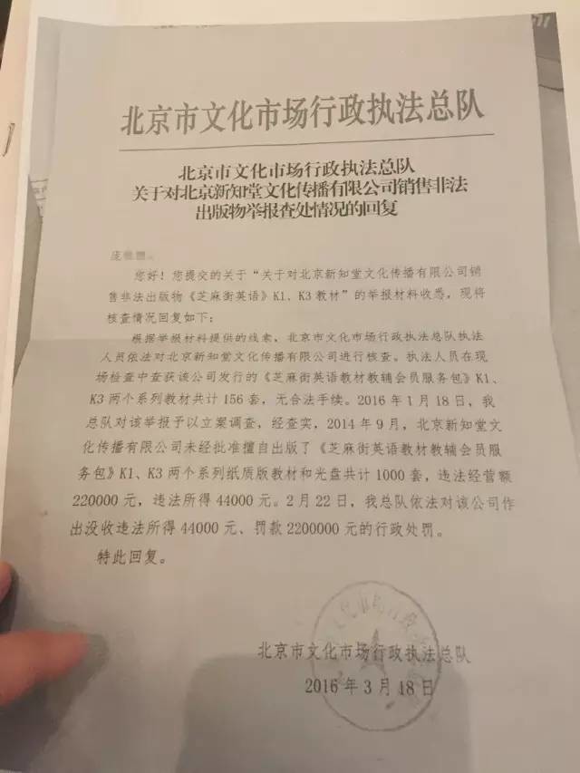 2016年3月,北京市文化市场行政执法总队向芝麻街英语一位加盟商庞先生出具的举报回复显示:芝麻街英语 K1、K2系列教材和光盘共计1000套,“无合法手续”,总队对该教材出版公司罚款220万,没收违法所得44000元。庞先生说,这套教材连盗版也算不上。