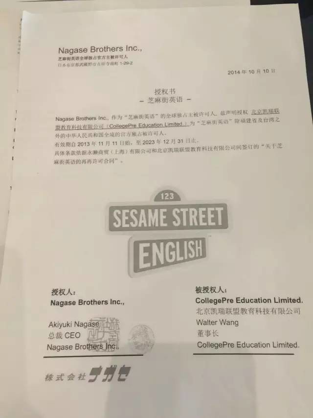 北京凯瑞联盟英语教育科技有限公司从日本获得的芝麻街英语授权书