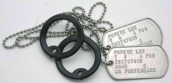 美军军用识别牌被军事爱好者称为“狗牌”,是美军现役必配的配置,用于士兵的身份识别。它是2张不锈钢薄板,尺寸为5cm×3cm,主牌有一条24英寸不锈钢的长颈链,副牌有一条4英寸的短颈链。并配有塑料消音垫圈。