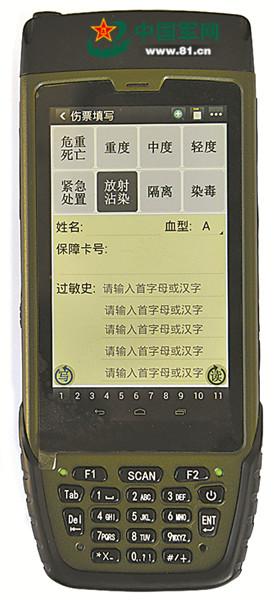 郝宇忠被送到伤员集中点后,军医汤金波拿出手持机对着他的副牌一扫,“伤病信息”立刻出现在手持机屏幕上:腹部中弹出血、B型血、青霉素过敏史……汤军医立即让人把他抬上手术台展开抢救。