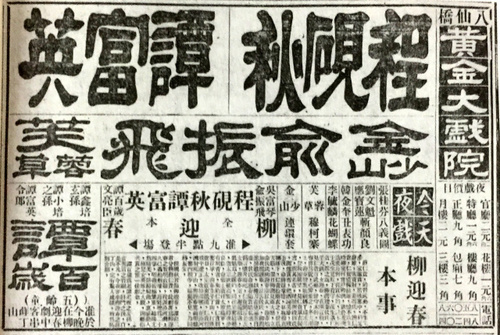 1933年,上海八仙楼黄金大戏院的海报上出现了一则别致的广告。“谭鑫培玄孙、谭小培令孙、谭富英令郎、五龄童谭百岁准在今晚《汾河湾》或《柳迎春》中客串薛丁山”。