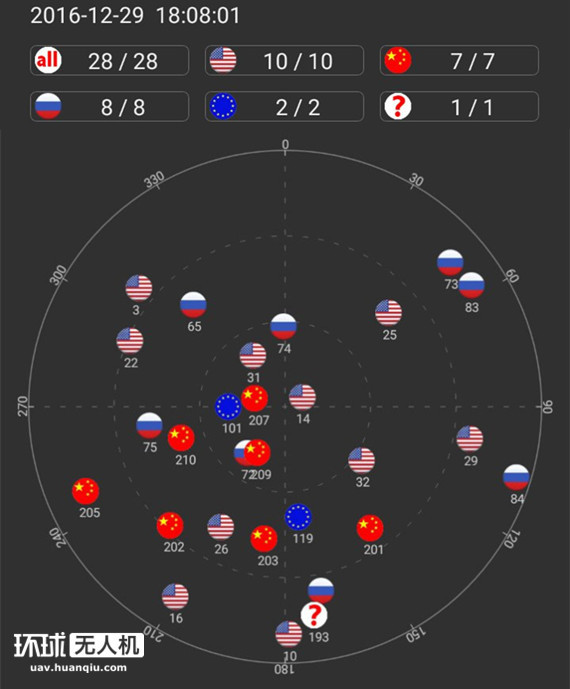 环球网无人机频道在北京的一个较为开阔的地方测试,可以搜索到10颗GPS、8颗格洛纳斯、7颗北斗和2颗伽利略。即使只用GPS也可以定位,但是有测试表明:能同时使用更多系统的卫星可以显著提高定位精度、定位速度。而且有“备胎”在有遮挡时更安全。