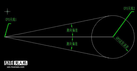 有天才想到:用两个高精度的RTK差分GPS天线就可以确定无人机的方向,行话叫“双天线测向”。原理正是初中平面几何知识:两点确定一条直线。根据几何原理两个天线的距离越远,测向的精度也就越高。(进阶:方向误差如上图,比对的是两个天线的相对位置,只需要计算一个天线的定位误差,)。