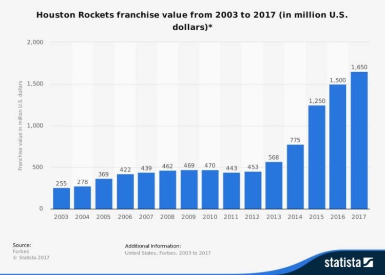 ▲ 火箭队从2003年到2017年的球队价值变化。数据来源:福布斯 图表来源:statista