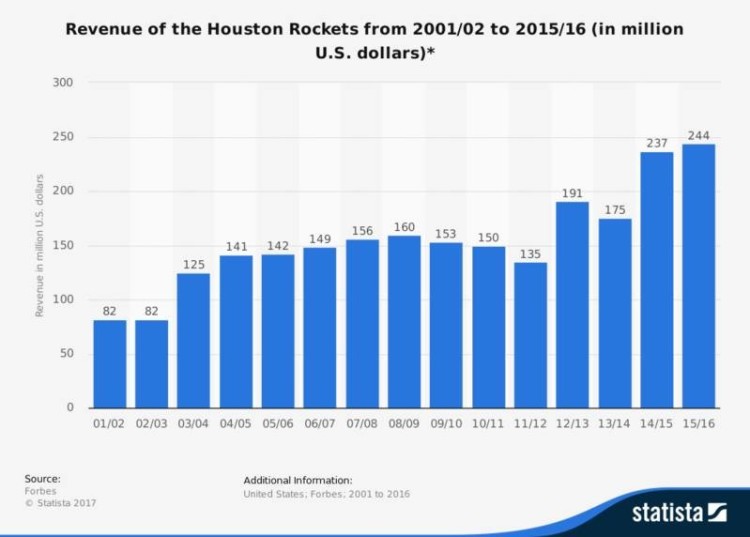 在福布斯公布的2016年NBA球队价值统计中,火箭队在2016年球队价值达到了16.5亿美元,位于NBA所有30支球队里面第八位。火箭CEO泰德·布朗在接受懒熊体育采访时表示,火箭队已经成立了一支专门面向中国市场的团队,将加大扩展中国业务。