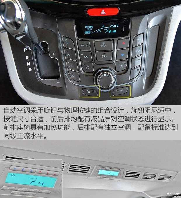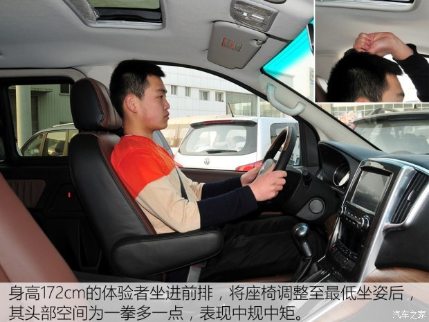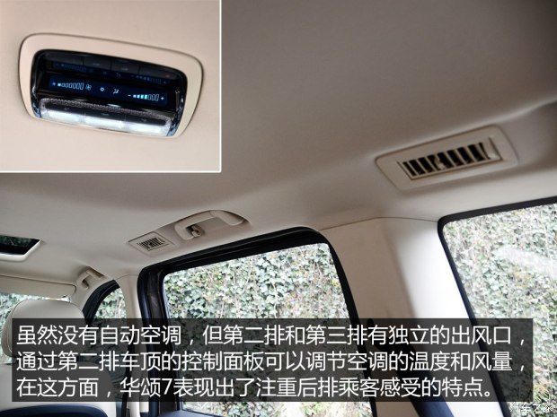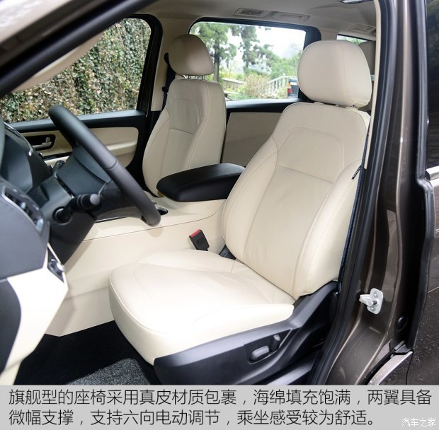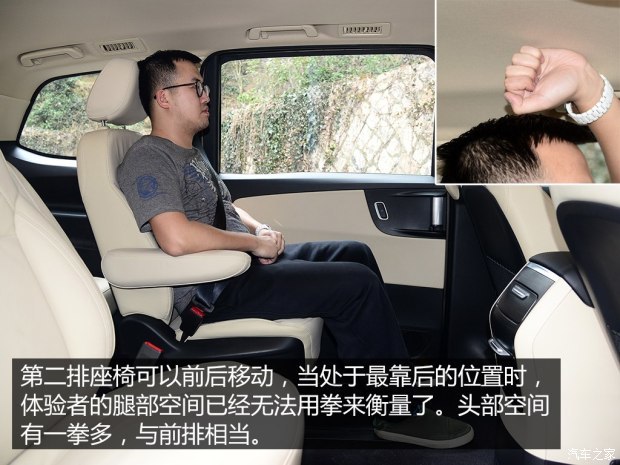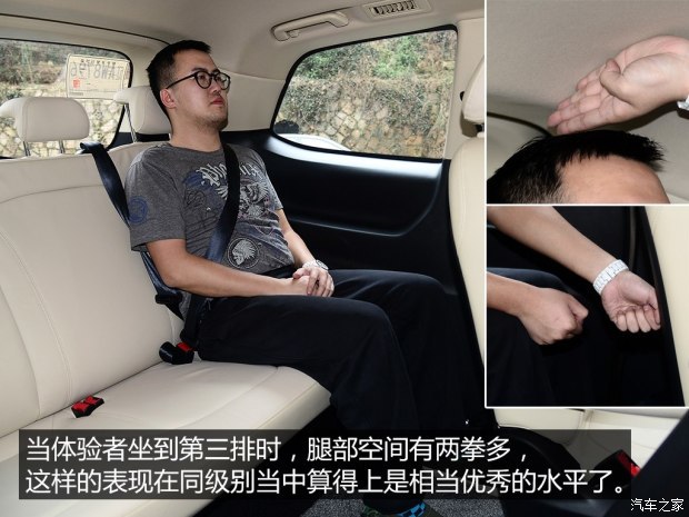 华颂72.0T舒适型座椅采用的是织物面料,在档次感方面与其它三款车型相比稍有不及。空间表现比较宽敞,第三排座椅活动头枕配备完善,舒适度优于前三款悬折式的座椅。后排所配备的独立空调比东风风行CM7与上汽大通G10表现要好,可以给予乘客较为舒适的乘坐环境。