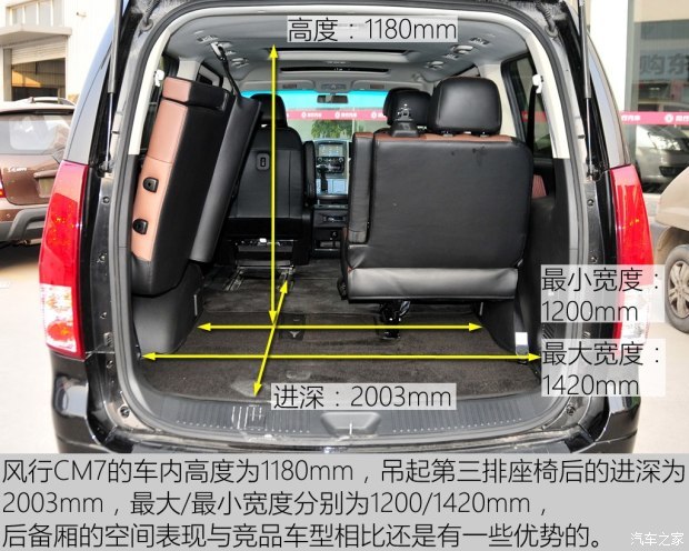 风行CM7在第三排座椅常规状态下,后备厢进深为610mm,够日常使用;第三排座椅在向两侧悬折后,其进深扩展至2003mm,是四款车型中最大的,装载物品具备一定的优势。
