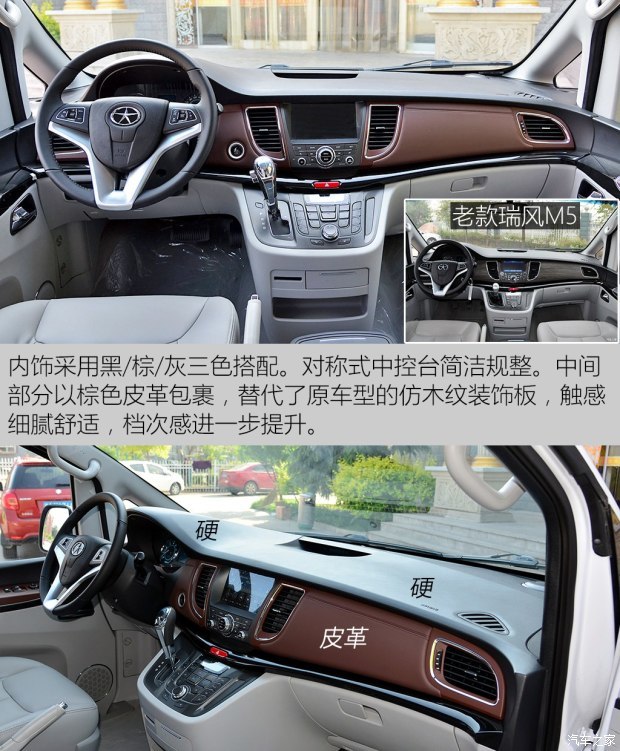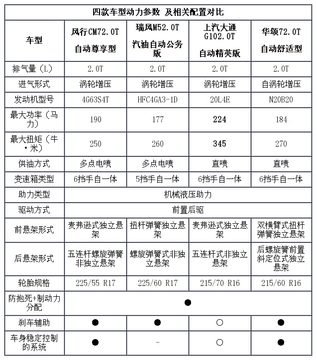 动力方面,瑞风M5采用2.0T+5挡手自一体变速箱的组合,发动机动力的账面参数相比其它三款车型较小;变速箱齿比的宽泛程度不及其它三款6挡变速箱车型,理论上不利于燃油经济性;轮胎规格为225/60 R17,在四款车型中是比较大的。