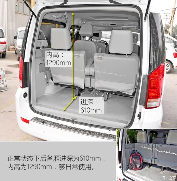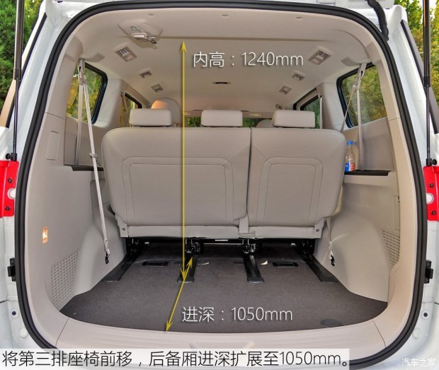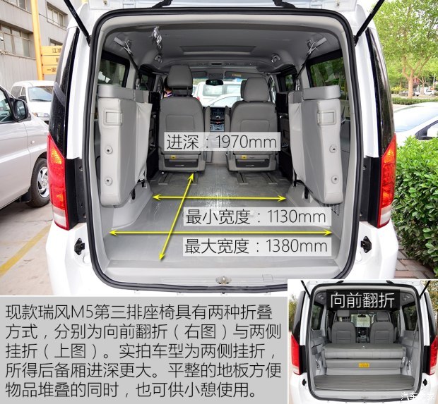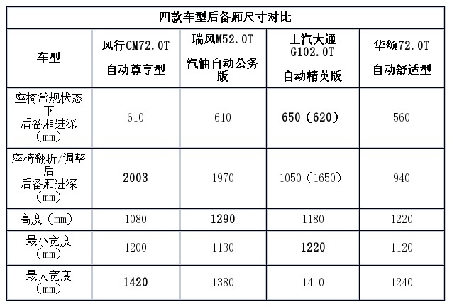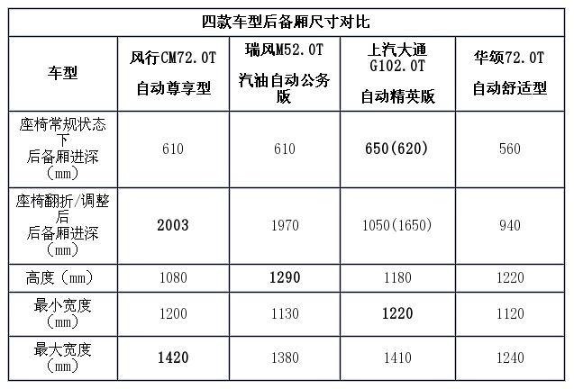 在座椅常规状态下,瑞风M5的后备厢进深为610mm,与风行CM7相同,够日常使用。最后排座椅折叠方式为两侧悬折,悬折后后备厢进深在这四款车是比较大的。
