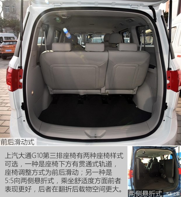上汽大通G10第三排座椅有两种样式可选,一种如图在座椅下方有贯通式轨道,另一种与前两款车型较为相似,由两个较大的座椅拼凑而成,可向两侧悬折。为了对比更为直接,以上参数来自于后者。该车的空间表现较为宽敞,精英型默认配置只配备了单侧滑门,另一侧可以选装,费用为4000元。和天窗一起选装的话会更实惠,总共5000元(单选装天窗也是4000元)。