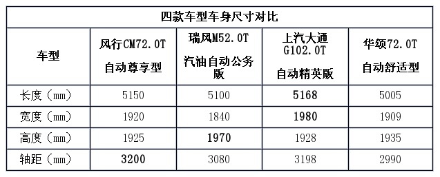 上汽大通G10的车身尺寸为5168×1980×1928mm,轴距为3198mm;与其它三款车型相比,在长度、宽度方面具备优势,同时3198mm的轴距尺寸与风行CM7近乎持平。