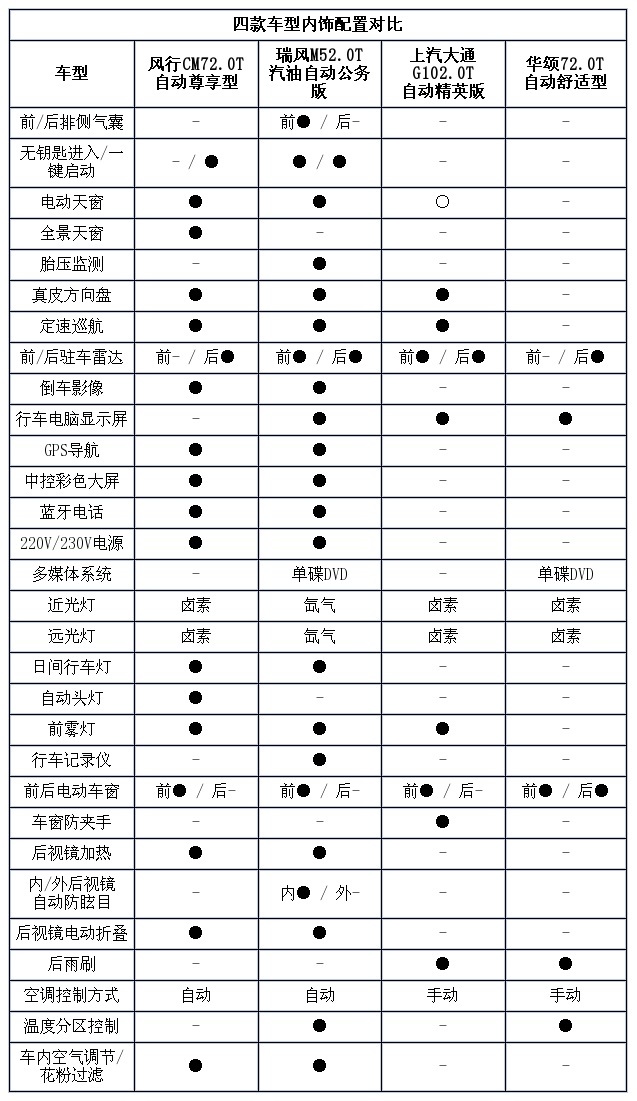 瑞风M5的配置在这四款车中是最高的,其中行车记录仪、胎压监测、氙气大灯是其它三款车型所没有的;电动天窗、内后视镜防眩目,后排独立空调、温度分区控制等也达到了四款车型的主流水平。