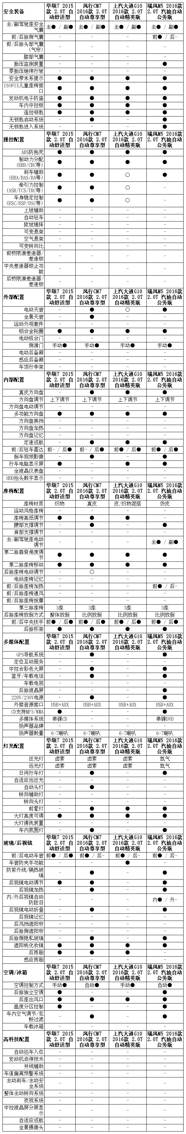 配置方面,风行CM7是四款车型中唯一一款配有双天窗的车型,增加了车内采光的同时,还有助于通风换气,属于国人较为在意的一款配置。除此之外,定速巡航、倒车影像、220V电源接口、日间行车灯、自动头灯、前雾灯、后视镜电动折叠等功能配置也都达到了这四款车的主流水平。