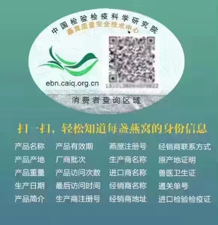 燕窝原产地生产企业通过CNCA审核认证,提供符合食品安全与质量保障的燕窝产品,加贴经过国家检验检疫,带有中国检验检疫科学研究院开发的“CAIQ燕窝溯源标签”。每一个合法溯源燕窝必备一个标签,四份正规文件。