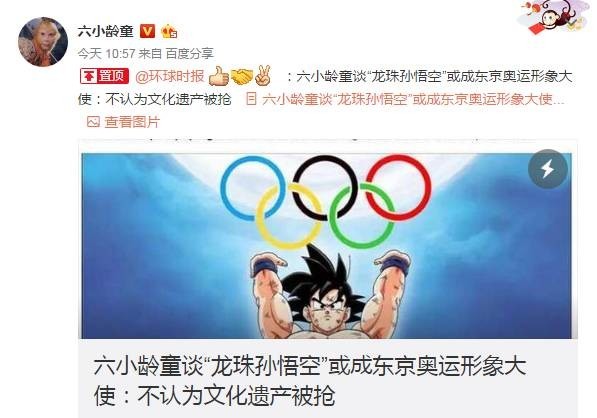 今天,环环就“七龙珠孙悟空”代言东京奥运采访了86版《西游记》孙悟空扮演者六小龄童。后者表示,他并不认为这是中国的艺术形象被外国抢走,“毕竟那个孙悟空并不是中国传统文化中的孙悟空。”