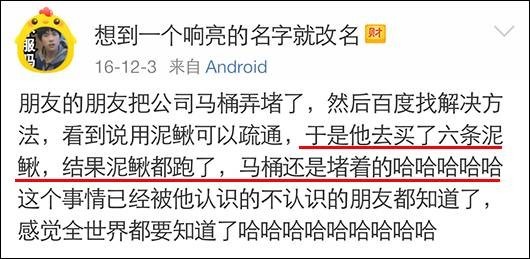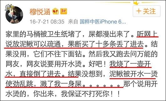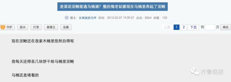 2014年11月27日,江苏常州网友“lifei7877171”发帖称,家中马桶出现了堵塞,他按照网上的方法把20块钱的泥鳅倒进马桶,又浇上一盆开水,本以为泥鳅遇热会往下水道钻。