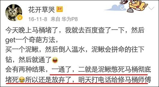@心头撞鹿_:说真的,我家前几天马桶堵了 搜百度好几个网页都说泥鳅