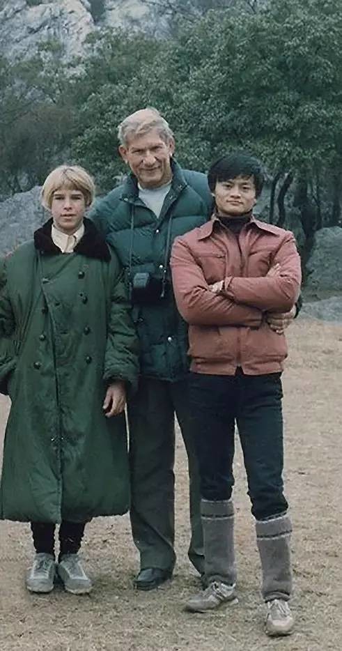 15岁的马云和他新认识的澳大利亚小玩伴戴维·莫利摄于西湖边。戴维胸前佩戴着澳中友好协会旅行团的证件。