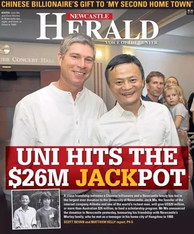 澳大利亚纽卡斯尔大学宣布:来自中国杭州的阿里巴巴董事局主席马云通过马云公益基金会,在纽卡斯尔大学设立了名为Ma-Morley奖学金计划——这笔2000万美元的奖学金,是纽卡斯尔大学有史以来收到的最大规模捐赠。