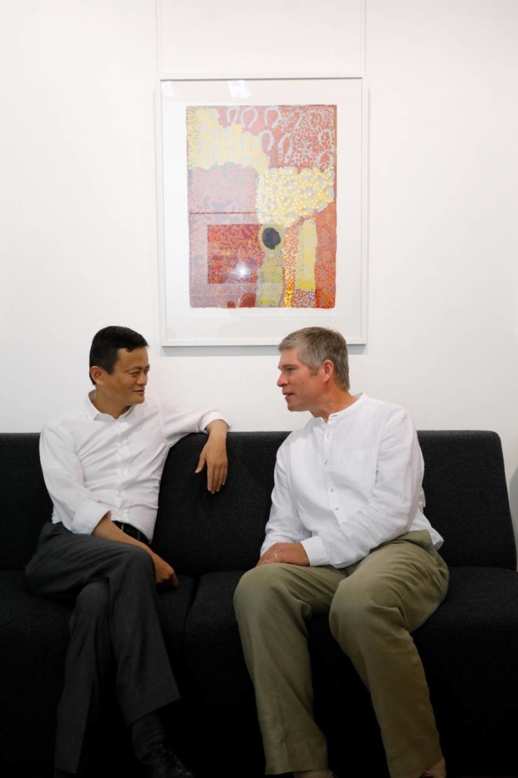 捐赠仪式开场前,马云和他的少年笔友,戴维·莫利在会场一角亲切聊天。