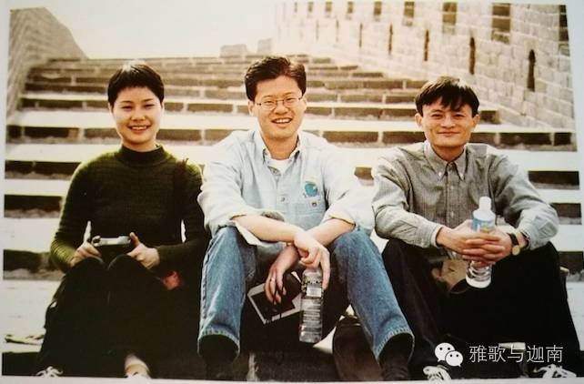 (邓肯透露,马云和杨致远最著名的长城合影,其实是p掉了张英的,这张三人合影才是真正的原版。)
