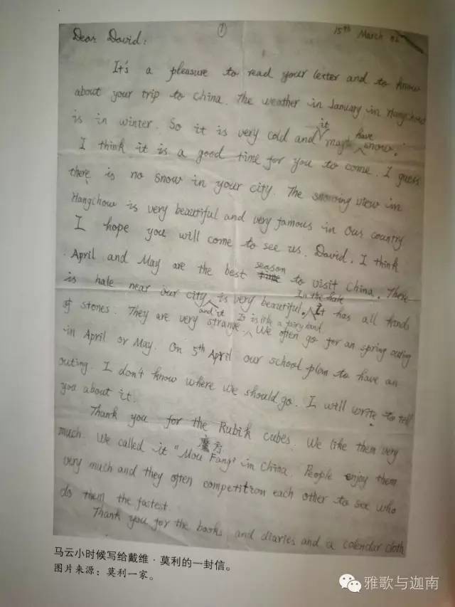通信数年后,肯莫利决定帮助一下这个上进的中国少年(真是得道多助啊),首先是文化上的:让马云把字距留大一点,可以在回信时把纠正写在空白处。