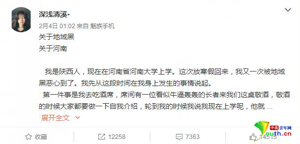 中国青年网北京2月7日电(实习记者 崔楠 记者 吴阳) 2月4日,一则凌晨发出的微博长文“关于地域黑,关于河南”引发热议。长文发出48个小时后,转发、点赞都超过了1万。河南有媒体以《河大上学的陕西女孩发文斥地域黑 很多人要请她吃饭》的题目发出了这篇文章。有网友直呼,感动了一亿人。