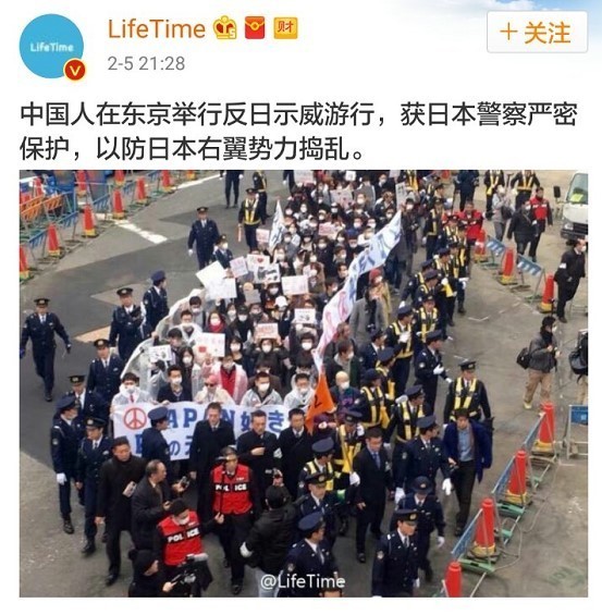 比如,下图中这个经常造谣和阴阳怪气地抹黑中国的微博账号“@LifeTime”,这次就再次造谣,称华人们是在“反日”,却获得了日本警察的保护。结果,他那群渣滓般的粉丝就彻底沸腾了: