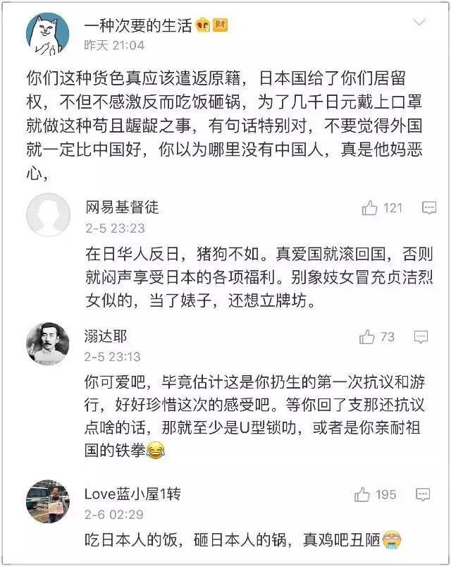 从上面这些评论中,我们不难发现这些辱骂那位女网友的汉奸日杂分子,不仅都故意偷换概念,把反对日本极右翼和APA酒店说成是“反日”;而且他们辱骂这位女网友的言辞,也都和游行现场那些日本极右翼分子喊出的口号出现了高度的吻合。