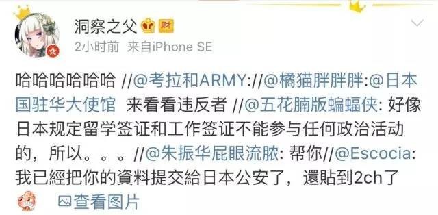 甚至有一个名为@Escocia,目前躲在海外的汉奸日杂,还在向日本警方和极右翼分子举报这些参加游行的华人的个人信息,以此恐吓那位女网友。而且极为智障的是,这个汉奸日杂的粉丝,还【造谣】说留学生和来日本工作的中国人“不能参加任何政治活动”,并要向日本驻华大使馆举报……