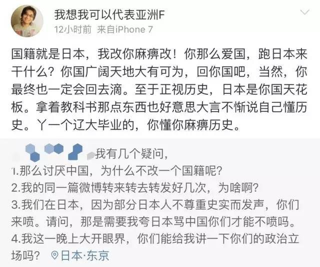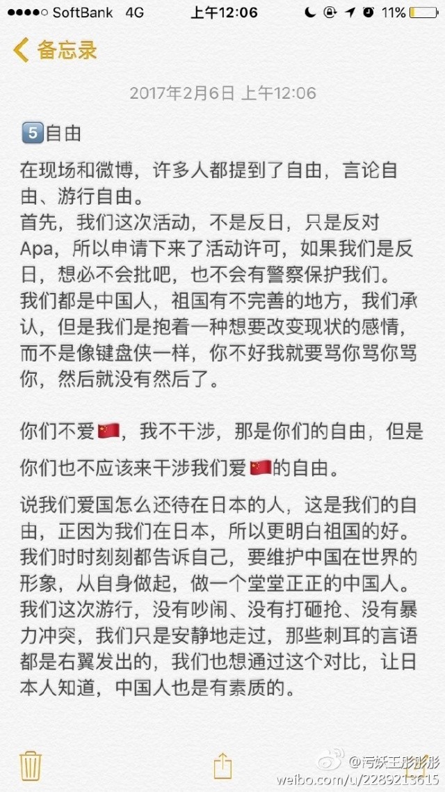 而国内网络上这些渣滓口中的“自由”同样也是如此。这不,当一位在现场参与了反APA游行的女网友在微博上发表了自己的感想后,她瞬间就遭到一群恶毒的汉奸日杂对她各种围攻!