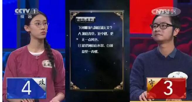 虽然武亦姝在C未出之前便抢答,却在报出C后难得一副惶惑的表情,尤其当C诗中出现“洞庭”二字后,她几乎已经判定自己的失误了。但答案出现,她答对了!小姑娘脸上终于又露出淡淡的笑容。