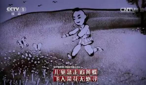 第一幅沙画下方两句七言诗,第二句倒数第二个字提示一个“处”字。当画到两只小蝴蝶时,武亦姝已了然于胸,按下抢答按钮,道出画中题诗“儿童急走追黄蝶,飞入菜花无处寻”。