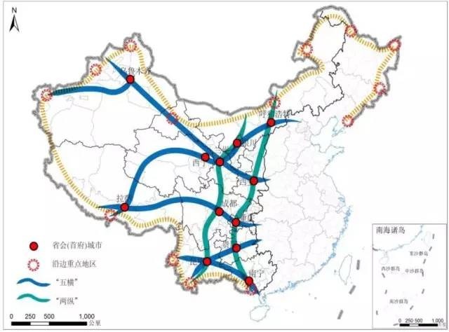 以重要交通走廊和中心城市为依托,着力培育若干带动区域协调协同发展的增长极,构建以陆桥通道西段、京藏通道西段、长江—川藏通道西段、沪昆通道西段、珠江—西江通道西段为五条横轴,以包昆通道、呼(和浩特)南(宁)通道为两条纵轴,以沿边重点地区为一环的“五横两纵一环”西部开发总体空间格局。
